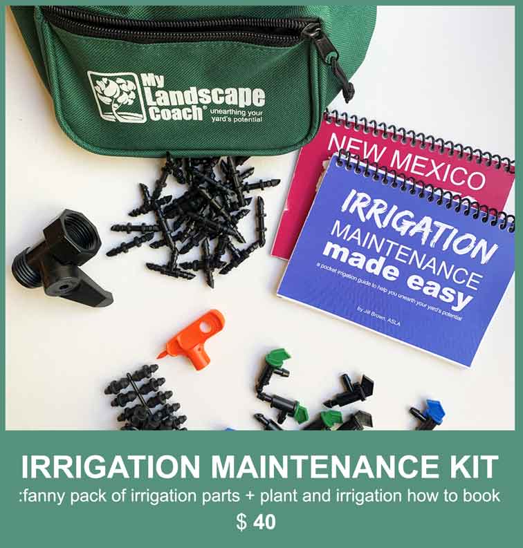 NM Plants Made Easy Book, Irrigation Maintenance Guide Book, Drip punch tool, Goof Plugs, end caps, Barbed, elbow, and T connectors. 1, 2 and 4 gph flag emitters, Hose shut off valve. Fanny Pack!